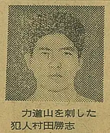 On December 8, 1963, Rikidōzan was stabbed once by Katsushi Murata, a member of the ninkyō dantai Sumiyoshi-ikka, a yakuza organization, after an altercation in a nightclub. Rikidōzan alleged that Murata stepped on his shoe, and demanded an apology. Murata refused and the two began to argue which eventually led to Rikidōzan punching Murata in the face, knocking him against a wall. Rikidōzan then mounted Murata and continued to punch him on the ground until Murata stabbed Rikidōzan once in the abdomen. Both immediately fled the scene and Rikidōzan was taken to Sannoh Hospital, where a doctor decreed the wound to be non-serious but advised Rikidōzan to have surgery. The surgery was successful and he returned home, but went against doctor's orders and began eating and drinking the same day, sending his assistant to the store for sushi and sake. Due to drinking so much, Rikidōzan worsened his condition and required a second surgery one week later, but had developed peritonitis and died at approximately 9:50pm on December 15, 1963. He was 39 years old.[18][19][20]