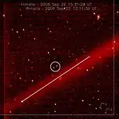 In September 2006, as NASA's New Horizons mission to Pluto approached Jupiter for a gravity assist, it photographed what appeared to be a faint, previously unknown planetary ring or ring arc, parallel with and slightly inside the orbit of the irregular satellite Himalia. The amount of material in the part of the ring or arc imaged by New Horizons was at least 0.04 km3, assuming it had the same albedo as Himalia. If the ring (arc) is debris from Himalia, it must have formed quite recently, given the century-scale precession of the Himalian orbit. It is possible that the ring could be debris from the impact of a very small undiscovered moon into Himalia, suggesting that Jupiter might continue to gain and lose small moons through collisions.[34]