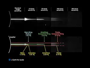 In back-scattered light[lower-alpha 3] the situation is different. The outer boundary of the main ring, located at 129,100 km, or slightly beyond the orbit of Adrastea, is very steep.[9] The orbit of the moon is marked by a gap in the ring so there is a thin ringlet just outside its orbit. There is another ringlet just inside Adrastean orbit followed by a gap of unknown origin located at about 128,500 km.[9] The third ringlet is found inward of the central gap, outside the orbit of Metis. The ring's brightness drops sharply just outward of the Metidian orbit, forming the Metis notch.[9] Inward of the orbit of Metis, the brightness of the ring rises much less than in forward-scattered light.[4] So in the back-scattered geometry the main ring appears to consist of two different parts: a narrow outer part extending from 128,000 to 129,000 km, which itself includes three narrow ringlets separated by notches, and a fainter inner part from 122,500 to 128,000 km, which lacks any visible structure like in the forward-scattering geometry.[9][12] The Metis notch serves as their boundary. The fine structure of the main ring was discovered in data from the Galileo orbiter and is clearly visible in back-scattered images obtained from New Horizons in February–March 2007.[7][13] The early observations by Hubble Space Telescope (HST),[3] Keck[4] and the Cassini spacecraft failed to detect it, probably due to insufficient spatial resolution.[8] However the fine structure was observed by the Keck telescope using adaptive optics in 2002–2003.[14]