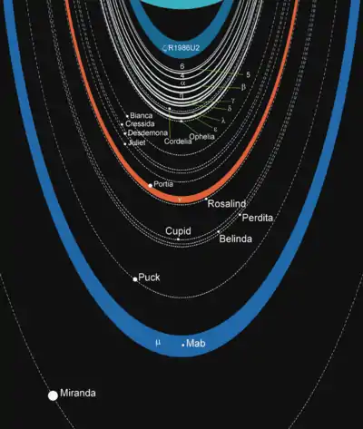The mechanism that confines the narrow rings is not well understood. Initially it was assumed that every narrow ring had a pair of nearby shepherd moons corralling it into shape. In 1986 Voyager 2 discovered only one such shepherd pair (Cordelia and Ophelia) around the brightest ring (ε), though the faint ν would later be discovered shepherded between Portia and Rosalind.[2]