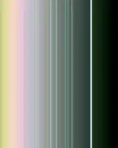 The γ ring is narrow, optically dense and slightly eccentric. Its orbital inclination is almost zero.[21] The width of the ring varies in the range 3.6–4.7 km, although equivalent optical depth is constant at 3.3 km.[22] The normal optical depth of the γ ring is 0.7–0.9. During a ring plane-crossing event in 2007 the γ ring disappeared, which means it is geometrically thin like the ε ring[16] and devoid of dust.[17] The width and normal optical depth of the γ ring show significant azimuthal variations.[16] The mechanism of confinement of such a narrow ring is not known, but it has been noticed that the sharp inner edge of the γ ring is in a 6:5 resonance with Ophelia.[26][28]