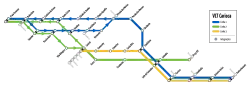 Rio de Janeiro Light Rail (Portuguese: VLT Carioca) is a modern light rail system serving Rio de Janeiro, Brazil. The system is among several new public transport developments in the region ahead of the city's successful bid for the 2016 Summer Olympics.[1] Its official name is VLT Carioca, the initialism "VLT" (which stands for veículo leve sobre trilhos, literally Light vehicle on rails) being equivalent to the English term light rail.