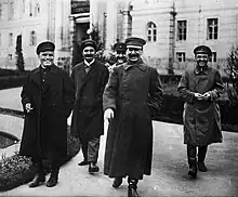 In 1922, Lenin's health was rapidly deteriorating alongside his relationship with Stalin.[8] Lenin and Trotsky had formed a bloc alliance in the same year to counter the bureaucratisation of the party and the growing influence of Stalin.[9][10] Various historians have cited Lenin’s proposal to appoint Trotsky as a Vice-Chairman of the Soviet Union as evidence that he intended Trotsky to be his successor as head of government.[11][12][13][14][15] From late 1922 to early 1923 Lenin wrote a pamphlet, urging the party to remove Stalin as General Secretary fearing his authoritarian tendencies. Posthumously referred to as "Lenin's Testament", Lenin strongly criticizes other major figures including Leon Trotsky, Nikolai Bukharin, and Felix Dzerzhinsky.[16][17][18] When Lenin died in January 1924, the party was thrown into a state of chaos and a vicious power struggle began. Stalin, through his office as General Secretary, received advanced knowledge about Lenin's Testament and sought to delay its release.[19] Upon the pamphlet's release to the party, Stalin offered a resignation from the position of General Secretary but his offer was rebuked by the greater party which desired to maintain the image of party unity.[20] With his position secure, Stalin began to focus on consolidating his power and leveraging antagonisms among the Bolshevik Party's leaders. Many were members of the Party's supreme organ, the Politburo, but rivalries extended beyond that. Several People's Commissars (or Ministers in other countries) were involved in the Party's internal personal as well as political struggles. The main factions within the party was the intellectual "left wing", composing Grigory Zinoviev and Lev Kamenev. Opposing them was the trade unionist "right wing" faction of the party consisting of Nikolai Bukharin, Mikhail Tomsky and Alexei Rykov. Leon Trotsky led a group of his own supporters. In this environment of party polarization, Stalin painted himself as a moderate labeling his faction "the centre" while quietly building alliances with both sides through the mid-1920s.[21]
