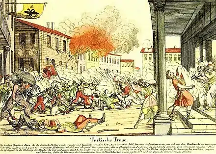 The Ottoman Sultans attempted to implement various economic reforms in the early 19th century in order to address the grave issues mostly caused by the border wars. The reforms, however, were usually met with resistance by the military captaincies of Bosnia. The most famous of these insurrections was the one by captain Husein Gradaščević in 1831. Gradaščević felt that giving autonomy to the eastern lands of Serbia, Greece and Albania would weaken the position of the Bosnian state, and the Bosniak peoples.[15] The situation worsened when the Ottomans took 2 Bosnian provinces and gave them to Serbia, as a friendly gift to the Serbs.[16][17][18] Outraged, Gradaščević raised a full-scale rebellion in the province, joined by thousands of native Bosnian soldiers who believed in the captain's prudence and courage, calling him Zmaj od Bosne (dragon of Bosnia). Despite winning several notable victories, notably at the famous Battle of Kosovo, the rebels were eventually defeated in a battle near Sarajevo in 1832 after Herzegovinian nobility which supported the Sultan, broke stalemate. Husein-kapetan was banned from ever entering the country again, and was eventually poisoned in Istanbul. Bosnia and Herzegovina would remain part of the Ottoman Empire until 1878. Before it was formally occupied by Austria-Hungary, the region was de facto independent for several months. The aim of the movement of Husein Gradaščević was to keep status quo in Bosnia. Bosniak nationalism in the modern sense would emerge under the rule of the Austro-Hungarian Empire.[19]