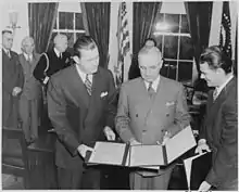 In 1944, Roosevelt appointed Hannegan, who had been the Collector of Internal Revenue in St. Louis, to the DNC after testing him by asking for his help with his income tax return.[1] As Democratic chairman, Hannegan was responsible for brokering the deal that made Truman Roosevelt's running mate that year. Shortly before the 1944 Democratic National Convention, Roosevelt famously sent Hannegan a letter stating he would be "happy to run with" either Truman or Supreme Court Justice William O. Douglas. Vice President Henry A. Wallace nearly won the nomination, but Hannegan worked feverishly to secure Truman's nomination. Hannegan later joked he wanted his tombstone inscribed with the words "Here lies the man who stopped Henry Wallace from becoming President of the United States."[2]