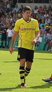 Lewandowski ended the 2013–14 season as the top goalscorer in the Bundesliga with 20 goals, which earned him the Torjägerkanone.[60] He also scored six goals in the Champions League, as Dortmund reached the quarter-finals.[61] During the second leg of the round of 16 match between Borussia Dortmund and Zenit, Lewandowski received a second yellow card, which resulted in his suspension for the first leg of the quarter-final against Real Madrid.