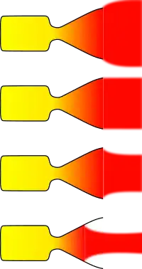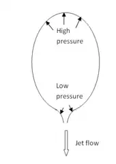 The shape of the nozzle is important. Consider a balloon propelled by air coming out of a tapering nozzle. In such a case the combination of air pressure and viscous friction is such that the nozzle does not push the balloon but is pulled by it.[69] Using a convergent/divergent nozzle gives more force since the exhaust also presses on it as it expands outwards, roughly doubling the total force. If propellant gas is continuously added to the chamber then these pressures can be maintained for as long as propellant remains. Note that in the case of liquid propellant engines, the pumps moving the propellant into the combustion chamber must maintain a pressure larger than the combustion chamber – typically on the order of 100 atmospheres.[2]