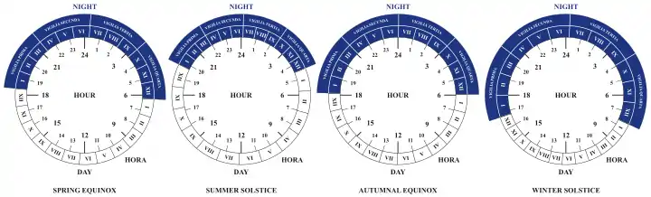 An hour was defined as one twelfth of the daytime, or the time elapsed between sunset and sunrise. Since the duration varied with the seasons, this also meant that the length of the hour changed. Winter days being shorter, the hours were correspondingly shorter and longer in summer.[1] At Mediterranean latitude, one hour was about 45 minutes at the winter solstice, and 75 minutes at summer solstice.[2]