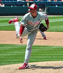 On December 15, 2009, the Blue Jays traded Halladay to the Philadelphia Phillies for minor league prospects Travis d'Arnaud, Kyle Drabek, and Michael Taylor.[44] He agreed to a contract extension worth US$60 million that included a US$20 million vesting option for a fourth season.[40] Phillies general manager Ruben Amaro, Jr. had unsuccessfully attempted to get Halladay at the non-waiver trade deadline in July 2009, then traded for Cliff Lee instead. Three hours before Halladay signed the contract extension, Amaro traded away Lee, to the surprise of Halladay who thought that Lee would be his teammate.[45][46]
