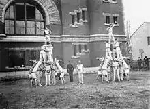 This photo of Royal Military College of Canada cadets doing a gymnastics routine, taken in 1901 in Kingston, is part of the Canada Patent and Copyright Office collection. The cadets are performing human pyramids, where the students work on balance, strength, cooperation, and teamwork. In this stunt, participants form pyramids of layers of persons, each standing on two others one level lower, one half a position to the right and the other to the left.