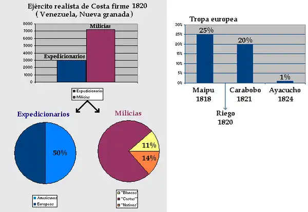 The American militias reflected the racial make-up of the local population. For example, in 1820 the royalist army in Venezuela had 843 white (español), 5,378 Casta and 980 Native soldiers.