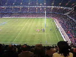 By the 1950s Britain and Wales were beginning to benefit from improved economic conditions. This saw growth in consumer power and spending, which drew many people away from traditional spectator past times, such as sport and the cinema. With a newfound wealth the populace began switching from social pursuits to home entertainment, with the biggest draw being the availability of television. From the mid-fifties there was a significant drop in gate receipts as television became more and more popular. During the 1955 Five Nations Championship, the Scotland v. Wales match was televised live; at the same time an Aberavon v. Abertillery game which would normally draw a crowd of 4000 was unable to muster 400. This created a situation whereby rugby in Wales was gaining in popularity due to the number of people who could now watch the international matches, but support at club level declined.[35] This forced club committees to adopt different strategies to keep their clubs afloat. Many teams set up 'coupon funds' to allow clothing rations to be contributed by members to buy kit. With careful management and thrift most clubs not only survived but grew. Throughout the 1950s and 1960s, with little money, many clubs were able to build new facilities or even own their grounds and club-houses for the first time in their history.[36] In 1951 Glamorgan Wanderers purchased the Memorial Grounds in Ely and in 1952 Llanelli were able to purchase the rugby portion of Stradey Park. Similarly, 1954 saw Blaina construct a new stand while Llanharan were able to build their first changing rooms procured from RAF surplus units. These events were typical of club expansion through the 50s. It was around this time that club social activities were extended including the introduction of ladies’ committees.[36]