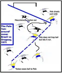 The move was demonstrated by Brazilian footballer Pelé during the 1970 FIFA World Cup match against Uruguay.[2] In the second half, Brazilian centre-forward Tostão played a through pass to Pelé as a counter-attack started. Sprinting up the middle, Pelé was immediately confronted with the Uruguayan goalkeeper Ladislao Mazurkiewicz who came off his line quickly. Pelé got there first and fooled Mazurkiewicz by not touching the ball, causing it to roll to the goalkeeper's left, while Pelé went to the goalkeeper's right.[3] Circling the goalkeeper to collect, Pelé shot while turning towards the goal, but he turned too much while shooting, and the ball drifted just wide of the far post.[3]