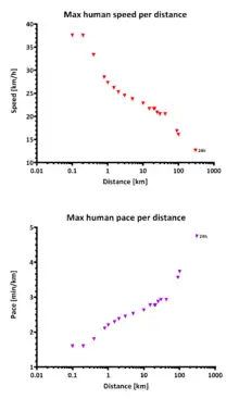 The fastest human footspeed on record is 44.7 km/h (12.4 m/s; 27.8 mph), seen during a 100-meter sprint (average speed between the 60th and the 80th meter) by Usain Bolt.[85]