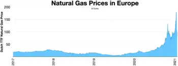 Due to a combination of unfavourable conditions, which involved soaring demand of gas, less power generation by alternative sources, and cold winter that left European and Russian reserves depleted, Europe faced steep increases in gas prices in 2021.[52] In August 2021 Russia reduced volumes of gas sent to European Union,[53][54] which was seen by some analysts and politicians as an attempt to "support its case in starting flows via Nord Stream 2".[55] The record-high prices in Europe were driven by a global surge in demand as the world quit the economic recession caused by COVID-19, particularly due to strong energy demand in Asia,[56][57] as well as lowered supplies of natural gas from Russia to the European Union.[58]