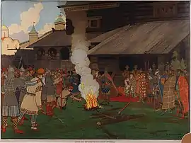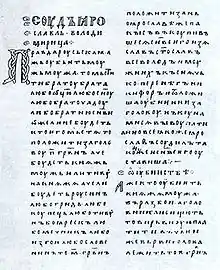 The Russkaya Pravda (Rus' Justice, Rus' Truth,[2] or Russian Justice;[3] Old East Slavic: Правда роусьскаꙗ, Pravda Rusĭskaya (13th century, 1280),[4][5] Правда Руськая, Pravda Rus'kaya (second half of the 15th century);[6][7] Russian: Русская правда, Russkaya Pravda; Ukrainian: Руська Правда, Rus'ka Pravda) was the legal code of Kievan Rus' and the subsequent Rus' principalities during the times of feudal division. It was written at the beginning of the 12th century and remade during many centuries. The basis of the Russkaya Pravda, Pravda of Yaroslav was written at the beginning of the 11th century. The Russkaya Pravda was a main source of Kievan Rus' law.[8][9]