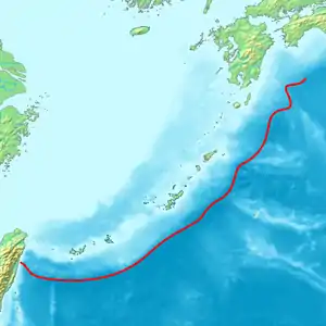 The Ryukyu Trench (琉球海溝, Ryūkyū kaikō), also called Nansei-Shotō Trench, is a 1398 km (868 mi)[1] long oceanic trench located along the southeastern edge of Japan's Ryukyu Islands in the Philippine Sea in the Pacific Ocean, between northeastern Taiwan and southern Japan. The trench has a maximum depth of 7460 m (24,476 ft).[1] The trench is the result of oceanic crust of the Philippine Plate obliquely subducting beneath the continental crust of the Eurasian Plate[2] at a rate of approximately 52 mm/yr.[3] In conjunction with the adjacent Nankai Trough to the northeast, subduction of the Philippine plate has produced 34 volcanoes.[4] The largest earthquake to have been recorded along the Ryukyu Trench, the 1968 Hyūga-nada earthquake, was magnitude 7.5 and occurred along the northernmost part of the trench [3] on 1 April 1968.[5] This earthquake also produced a tsunami.