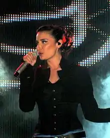 In October 2013, Sıla revealed that she had started working on her fifth album and the following month she began recording the songs.[22] A two-disc album titled Yeni Ay was released in February 2014 by Sony Music Entertainment and Columbia Records, and on its first week it sold 70,000 copies in Turkey, becoming number one on D&R's Best Selling List.[23][24] By the end of the year the album sold 158,000 copies in Turkey making Sıla the best-selling artist in 2014.[25][26] Yeni Ay also broke the record of sales on iTunes Store in Turkey, being the number-one best selling album for several months.[27] Most of the music critics liked the album and Hikmet Demirkol of Hürriyet described it as "an album full of surprises, an album with detail and content that will make the fans happy".[28] The album's lead single "Vaziyetler" was the number-one hit on Türkçe Top 20 for eleven weeks, while two other songs from the album, "Yabancı" and "Hediye", became number-one hits as well. "Reverans" ranked number two on the music charts.[29][30] At the 2014 Turkey Music Awards, Yeni Ay was chosen as the Best Album, while Sıla won the award for Best Female Artist and was honored as the artist with the most songs played on radio.[31]