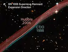 SN 1006's associated supernova remnant from this event was not identified until 1965, when Doug Milne and Frank Gardner used the Parkes radio telescope to demonstrate a connection to known radio source PKS 1459−41.[11] This is located near the star Beta Lupi, displaying a 30 arcmin circular shell.[12] X-ray and optical emission from this remnant have also been detected, and during 2010 the H.E.S.S. gamma-ray observatory announced the detection of very-high-energy gamma-ray emission from the remnant.[13] No associated neutron star or black hole has been found, which is the situation expected for the remnant of a Type Ia supernova (a class of explosion believed to completely disrupt its progenitor star).[14] A survey in 2012 to find any surviving companions of the SN 1006 progenitor found no subgiant or giant companion stars,[15] indicating that SN 1006 most likely had double degenerate progenitors; that is, the merging of two white dwarf stars.[15]