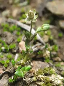 Sagina apetala is a species of flowering plant in the family Caryophyllaceae known by the common names annual pearlwort[1] and dwarf pearlwort. It is native to Europe and it is known elsewhere as an introduced species, including parts of North America. It grows in many types of disturbed habitat, such as cracks in the sidewalk. It is a petite annual herb producing a threadlike stem just a few centimeters long, spreading or growing erect. The plant is glandular and somewhat hairy. The leaves are linear in shape and not more than about a centimeter long. The inflorescence is a solitary flower borne on a threadlike pedicel. The flower has usually four sepals and generally no petals.