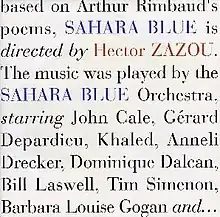 Sahara Blue is a 1992 concept album produced by Hector Zazou.[3] The album commemorated the 100th year of the death of French poet Arthur Rimbaud and included collaborative musical works by John Cale, Khaled, Ryuichi Sakamoto, Tim Simenon, and David Sylvian.[3]