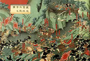 During the battle of Shiroyama, Saigō was badly injured in the hip. The exact manner of his death is unknown. There are no published reports by eyewitnesses. The accounts of his subordinates claim that he stood up and committed seppuku after his injury or that he requested that his friend Beppu Shinsuke assist his suicide. Three firsthand accounts of the condition of his deceased body exist. It is said that he was shot in the femur, then he thrust a sword into his stomach region, then was decapitated deliberately by a fellow citizen. All three accounts report that the body was decapitated. Two describe a bullet wound to the hip or thigh. As none of the eyewitness accounts mention a wound to the abdomen, or any fresh sword wound at all, it is unknown if Saigō pierced his stomach with his sword.[6] In debate, some scholars have suggested that neither is the case and that Saigō may have gone into shock following his wound, losing his ability to speak. Several samurai, upon seeing him in this state, would have severed his head, assisting him in the warrior's suicide that they knew he would have wished. Later, they would have said that he committed seppuku to preserve his status as a true samurai.[7]