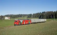Freight trains run regularly on the line from Monday to Friday. Garbage has been carried from Glovelier to the incinerator in La Chaux-de-Fonds since 2000. In addition, standard-gauge wagons are carried on transporter wagons, which primarily carry timber logs, fuel oil, gravel and road salt.[4] Scheduled steam trains are operated by La Traction from Pré-Petitjean to Glovelier, Tavannes or La Chaux-de-Fonds from July to September.[5]