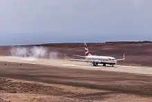 On 9 June 2017 Airlink won the bid to operate scheduled flights to St Helena Airport.[86] On 22 July 2017 it was announced the airline would operate weekly flights to Johannesburg via Windhoek in Namibia, with a monthly link to Ascension Island. The flights will be on Embraer E190 aircraft filling a maximum of only 76 of the 99 seats due to runway limitations related to the wind shear issues.[87][88] Airlink conducted a successful proving flight on 23 August 2017[89] and commenced passenger flights on 14 October 2017.[6] The first scheduled flight landed on 14 October 2017 around 14:00 UTC without any problems, although it was slightly delayed. The flight used the southbound direction, the one with wind shear problems, but the wind was fairly calm.[90] Airlink was after some time denied letting passengers embark and disembark in Windhoek, because Airlink was not given right to carry passengers between Namibia and foreign countries. From April 2019 Airlink refuels in Walvis Bay instead, giving right to have 98 passengers because of shorter distance, having in mind that no connections are allowed in Namibia anyway.[91] The flights still (2019) stop in Windhoek or Walvis Bay for refuel westbound, but fly nonstop to Johannesburg if there is not too much upwind.[92]