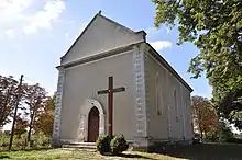 The church is one-nave, brick, plastered, in its modest architecture there are neo-Gothic features (pointed ends of the entrance portal, windows). Each of the surfaces of the side facades is divided by two pilasters.[4]