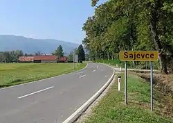 Sajevce lies on the left bank of the Krka River, at the southeastern edge of the Krakovo Forest. The village consists of three hamlets: Male Sajevce (literally, 'little Sajevce') is mostly fields and meadows and lies to the southwest, between the road and the Krka River; Velike Sajevce (literally, 'big Sajevce') is the village's population center to the northeast; and Poljane, with only one house, lies to the north surrounded by forest. Sajevec Creek, a tributary of the Krka, flows out of the forest and past the southwestern edge of the village. The soil is loamy.[3]