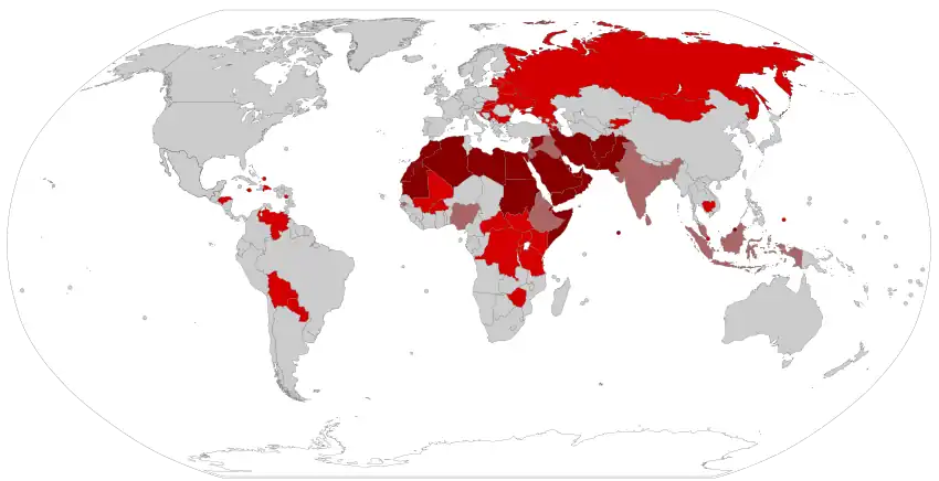 Adoption rights are not necessarily covered, though most states with same-sex marriage allow those couples to jointly adopt as other married couples can. In contrast, 35 countries (as of 2023) have definitions of marriage in their constitutions that prevent marriage between couples of the same sex, most enacted in recent decades as a preventative measure. Some other countries have constitutionally mandated Islamic law, which is generally interpreted as prohibiting marriage between same-sex couples. In six of the former and most of the latter, homosexuality itself is criminalized. There are records of marriage between men dating back to the first century.[4] It is legally recognized in a large majority of the world's developed democracies; notable exceptions are Italy, Japan, South Korea, Greece and the Czech Republic. It is not yet recognized in any of the world's Islamic polities. Some countries, such as China and Russia, restrict advocacy for same-sex marriage.[5][6]