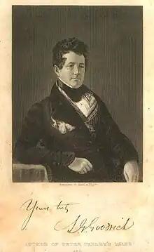 Goodrich was born at Ridgefield, Connecticut, the son of a Congregational minister. Goodrich was largely self-educated, and became an assistant in a country store at Danbury, Connecticut, which he left in 1808, and later again at Hartford, Connecticut, until 1811. From 1816 to 1822 he was a bookseller and publisher in Hartford. He visited Europe from 1823 to 1824, and moved to Boston in 1826. In 1833 he bought 45 acres (180,000 m2) in nearby Roxbury and built a home in what is now Jamaica Plain. There he continued in the publishing business, and from 1828 to 1842 published an illustrated annual, The Token, to which he was a frequent contributor both in prose and verse. A selection from these contributions was published in 1841 under the title Sketches from a Students Window. The Token also contained some of the earliest work of Nathaniel Hawthorne, Nathaniel Parker Willis, Henry Wadsworth Longfellow and Lydia Maria Child. In 1841 he established Merry's Museum, which he continued to edit till 1854. Goodrich was associated with his brother Charles A. Goodrich in writing books for the young. His series, beginning in 1827 under the name of Peter Parley, embraced geography, biography, history, science and miscellaneous tales. Of these he was the sole author of only a few, but in 1857 he wrote that he was the author and editor of about 170 volumes, and that about seven millions had been sold. An English writer, George Mogridge, also used the name Peter Parley, raising objections from Goodrich, who had the prior claim.