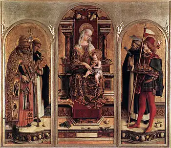 The San Domenico di Camerino Altarpiece is a 1482 tempera and gold on panel painting by Carlo Crivelli, probably originally painted in Camerino and now divided between the Pinacoteca di Brera, in Milan, the Stadel Museum, in Frankfurt, and the Abegg-Stockar Collection, in Zurich.