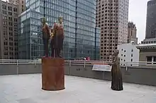 The San Francisco Comfort Women memorial and its bronze, 10-foot-tall "Comfort Women" Column of Strength statue were unveiled on September 22, 2017.[7] The memorial statue was designed by the Carmel-based sculptor Steven Whyte. It depicts three teen-age girls, with each being of a specific nationality—Chinese, Korean, and Philippine—and altogether representing the estimated 200,000 "comfort women" from countries across East and Southeast Asia that were occupied by the Imperial Japanese Army before and during World War II.[7] These three girls are cast in bronze, standing in a circle atop a pedestal and holding hands in a back-to-back posture. Standing next to the pedestal and gazing up at them is another bronze figure of a halmoni (Korean for grandmother). It bears a resemblance to the Korean human rights activist Kim Hak-Sun, who was a victim of the forced enslavement to the Imperial Japanese Army during WWII and the first woman in Korea to come forward publicly about her experiences as a comfort woman.[7]