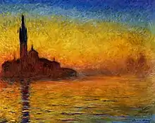 Saint-Georges majeur au crépuscule (Eng: Dusk in Venice, San Giorgio Maggiore by Twilight[1] or Sunset in Venice) refers to an Impressionist painting by Claude Monet, which exists in more than one version. It forms part of a series of views of the monastery-island of San Giorgio Maggiore. This series is in turn part of a larger series of views of Venice which Monet began in 1908 during his only visit there.