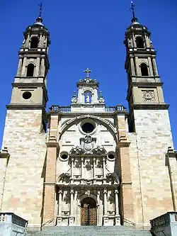 The central façade is sided by two slender bell towers dating to the 20th-century edifice.