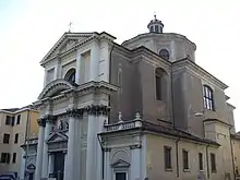 A parish church was located at the site since the 13th century, and rebuilt in 1751–1763 in the Baroque style using designs of Domenico Corbellini.[1] The Latin cross layout is surmounted by an octagonal cupola with lantern.