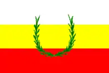 The flag is divided horizontally into three stripes; white at the top, yellow in the center and red at the bottom, and may be decorated with sugarcane stems.[32]