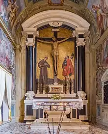 However, the grand project almost immediately suffered a major setback, caused by the tragic events of the reconquest of Brescia by Milan at the hands of the French, which would end with the bloody sacking of 1512.[26] The building revival of the monastery, most likely, was not to take place in the years immediately following, as Venice regained possession of the city once again: from 1520 onward, however, the works experienced intense activity.[27] In 1532 the organ by Gian Giacomo Antegnati was installed, while the structures of the monastery, especially the cloisters and the new dormitory, were substantially completed.[27] However, in the second half of the century, Lattanzio Gambara frescoed the entire presbytery area: his work would be admired a few years later, in 1566, by Giorgio Vasari, who was visiting Brescia.[28][29] Meanwhile, master builder Geronimo Tobanello, who was already working in other areas of the monastery, took care of the first adaptations of Renaissance architecture inside the church, affixing on the walls of the aisles, around the chapels, a rhythmic succession of marble lesenes, all designed by Giovanni Maria Piantavigna.[28] The first chapel on the right was also renovated, building a new altar reusing parts of the old one and dedicating it to St. Michael the Archangel.[28] The work was taken over during the visit of St. Charles Borromeo in October 1580,[30] who took note of both the embellishment lesenes and the new chapel and ordered that the north wall of the church, which had remained intact up to that time, be broken through to create three new mirrored chapels.[31]