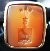The red variety of chalcedony has been known to be used as beads since the Early Neolithic in Bulgaria. The first faceted (with constant 16+16=32 facets on each side of the bead) carnelian beads are described from the Varna Chalcolithic necropolis (middle of the 5th millennium BC).[5] The bow drill was used to drill holes into carnelian in Mehrgarh in the 4th-5th millennium BC.[6] Carnelian was recovered from Bronze Age Minoan layers at Knossos on Crete in a form that demonstrated its use in decorative arts;[7] this use dates to approximately 1800 BC. Carnelian was used widely during Roman times to make engraved gems for signet or seal rings for imprinting a seal with wax on correspondence or other important documents. Hot wax does not stick to carnelian.[8] Sard was used for Assyrian cylinder seals, Egyptian and Phoenician scarabs, and early Greek and Etruscan gems.[9] The Hebrew odem (also translated as sardius), the first stone in the High Priest's breastplate, was a red stone, probably sard but perhaps red jasper.[9] In Revelation 4:3, the One seated on the heavenly throne seen in the vision of John the apostle is said to "look like jasper and σαρδίῳ (sardius transliterated)." And likewise it is in Revelation 21:20 as one of the precious stones in the foundations of the wall of the heavenly city.[10]