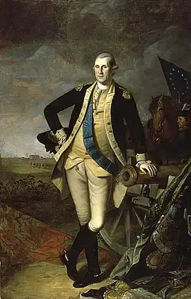In the United States, George Washington, who served as commander-in-chief of the Continental Army during the American Revolutionary War and later served as the first President of the United States, was noted for wearing a blue ribbed sash, similar to that of the British Order of the Garter, early in the war, as he had in 1775 prescribed the use of green, pink, and blue sashes to identify aides de camp, brigade-majors, brigadiers general, majors general, and the commander in chief in the absence of formal uniforms. He later gave up the sash as "unrepublican" and "pretentious for all but the highest-ranking aristocracy", according to historians. Washington is seen wearing the sash in Charles Wilson Peale's 1779 painting Washington at Princeton.[9][10]