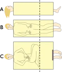 One variant presents the front of the box to the audience (A). Expecting the box is the size of an ordinary chest, they may assume that the "victim" is arranged (B), crossing the path of the saw. In reality, the box may be deeper (which the audience cannot see from their perspective), and the "victim" curled up to clear the blade (C).