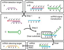 Fluorophore-labeled scRNAs have been engineered to transduce between detection of mRNA targets and generation of bright fluorescent amplification polymers in situ (Figure 1).[2] In this context, scRNA signal transduction enables multiplexed mapping of mRNA expression within intact vertebrate embryos (Figure 2).[2] scRNAs have been engineered to perform shape and sequence transduction to conditionally produce a Dicer substrate targeting 'silencing target' mRNA Y upon detection of an independent 'detection target' mRNA X, with subsequent Dicer processing yielding a small interfering RNA (siRNA) targeting mRNA Y for destruction (Figure 3).[1] In this context, scRNA signal transduction provides a step towards implementing conditional RNA interference (Figure 4).