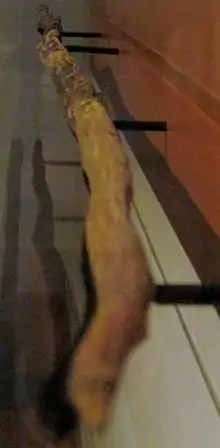 Experimental research using experienced athletes to throw replicas of Spear II show that the spears are capable of being thrown at distances of at least 15 to 20 m (49 to 66 ft), and are similar in weight and balance to javelins.[33][34][35] However, Spear VI, which does not taper at the back and also has a natural kink, is interpreted as a thrusting spear,[36] and replicas of Spear II have also been experimentally tested as thrusting spears.[37] Ethnographically, wooden spears were used as both thrusting and throwing spears.[38] Together the evidence suggests that the Schöningen spears most likely had multiple uses including for self-defence against dangerous predators such as saber-toothed cats, with whom the humans shared the landscape.[39]