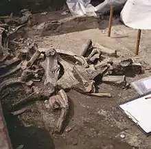 As of 2015, around 1500 stone tools and over 12,000 animal bones were found.[42] The stone tools comprise denticulates, some bifacially worked tools, retouched flakes and scrapers, but there are no handaxes or handaxe thinning flakes.[43] As such the stone tools are interpreted as late Lower Palaeolithic in nature. The majority of animal bones with signs of butchery belong to an extinct species of horse (Equus mosbachensis). Also present are red deer and large bovids.[44][45] Marks on the bones suggest that the humans had first access to the carcasses, and that carnivores such as wolves and sabre-tooth cats accessed the bones later. Marks from stone tools suggest that humans worked together to butcher their prey.[46] Bone tools have also been discovered in the 'Spear Horizon', and are suggested to have been used for knapping flint and for breaking open other bones for marrow.[47]