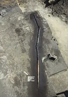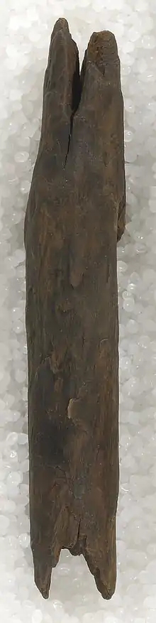 In addition to the spears and double-pointed sticks, a charred wooden stick made of spruce and measuring 87.7 by 3.6 cm (34.5 by 1.4 in) was also found at Schöningen 13 II-4, and is interpreted as a possible skewer.[40] Hundreds of additional wooden fragments from the site are the subject of ongoing research by a multidisciplinary team.