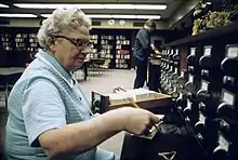 School librarian with card files (Minnesota, 1974) Photo for historical perspective. Most school Libraries use computer based electronic catalog for holdings and search functions and NO longer use card catalogs.