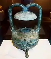 Donald B. Wagner writes that most domestic iron tools and implements produced during the Han were made of cheaper and more brittle cast iron, whereas the military preferred to use wrought iron and steel weaponry due to their more durable qualities.[25] During the Han dynasty, the typical 0.5 m (1.6 ft) bronze sword found in the Warring States period was gradually replaced with an iron sword measuring roughly 1 m (3.3 ft) in length.[26] The ancient dagger-axe (ge) made of bronze was still used by Han soldiers, although it was gradually phased out by iron spears and iron ji halberds.[27] Even arrowheads, which were traditionally made of bronze, gradually only had a bronze tip and iron shaft, until the end of the Han when the entire arrowhead was made solely of iron.[27] Farmers, carpenters, bamboo craftsmen, stonemasons, and rammed earth builders had at their disposal iron tools such as the plowshare, pickaxe, spade, shovel, hoe, sickle, axe, adze, hammer, chisel, knife, saw, scratch awl, and nails.[28] Common iron commodities found in Han dynasty homes included tripods, stoves, cooking pots, belt buckles, tweezers, fire tongs, scissors, kitchen knives, fish hooks, and needles.[27] Mirrors and oil lamps were often made of either bronze or iron.[29] Coin money minted during the Han was made of either copper or copper and tin smelted together to make the bronze alloy.[30]