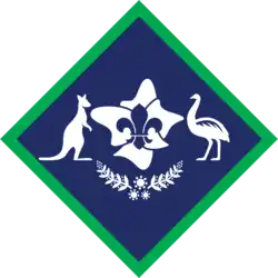 The badge consists of the Scouts Australia logo in white above some wattle with a kangaroo to the left and an emu to the right to mimic the Australian Coat of Arms, on a plain navy blue diamond-shaped badge with green edging, and is placed at the top of the left sleeve of the uniform. Once earned, a Scout may wear the badge for the rest of their Scouting Journey, even into other sections.[3]