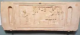 The literacy of a librarius was also valued in business settings, where they might serve as clerks.[53] For example, a libraria cellaria would be a woman who kept business records such as inventories.[54] An early 2nd-century marble relief from Rome depicts a female scribe, seated on a chair and writing on kind of a tablet, facing the butcher who is chopping meat at a table.